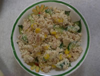 おからが届いて、始めに何を作ろうか悩んで、結局サラダに挑戦してみました。 サラダには、おから、コーン、きゅうり、ツナ。 食感が楽しく、おいしくできたけど、マヨネーズを少なめにして酢を多めに入れたせいか、一口目だけむせてしまいました。